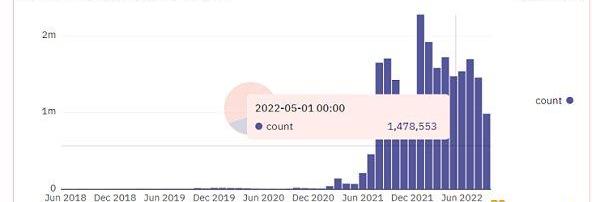 2021年是NFT的元年,NFT市場在2022初達到48億美金的交易量頂峰,于今年6月出現斷崖式下滑opensea月交易量僅6.9億美金。不論是NFT玩家通過社區的反饋還是分析師通過對鏈上數據進行分析,都紛紛表示NFT寒冬將至。通過參考opensea上的NFT每月售出NFT的數量來看,3月以后的NFT市場月交易總頻次并未發生像交易量萎縮同等幅度的變化。