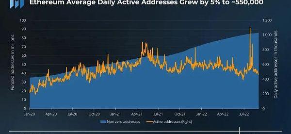 活動地址自然也遵循了與交易類似的模式。本季度的日活躍地址為55萬,比上一季度增長了5%。增長的主要原因是2022年7月27日活躍地址的激增,當時著名的以太坊礦工ChandlerGuo宣布了以太坊PoW分叉的計劃,以及幣安的一些錢包“維護活動”。最重要的是,這些活動很可能不是因為有新的用戶涌入,也不是因為有新的應用。