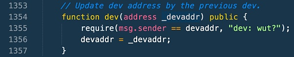 在Yuno項目中的MasterChef.sol智能合約第1354行中,dev方法可以允許當前擁有devaddr身份的智能合約調用者,將devaddr身份轉移給另外一個地址。