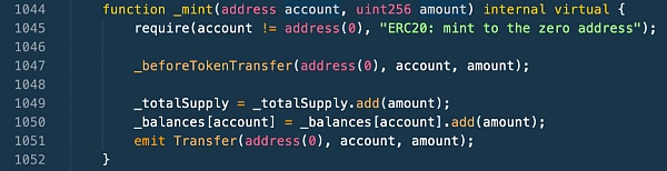 擁有devaddr身份的調用者,當其身份恰好同時為owner身份的時候,可以通過調用MasterChef.sol智能合約1282行的mint方法,來無限制的增發代幣。1282行的mint方法會繼續調用1130行的mint方法,并繼續由1130行mint方法調用1044行的_mint方法,并最終完成代幣增發的操作。