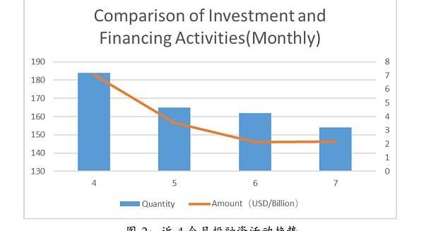 不過如果以月為單位來看,我們卻感受到了一絲涼意。從4月到7月,投融資活動的數量和金額在單調下降。4個月間投融資總金額下降了近70%,數量下降了16%。投融資市場冷清的狀態基本與我們訪談的投資人的心理狀態相符。