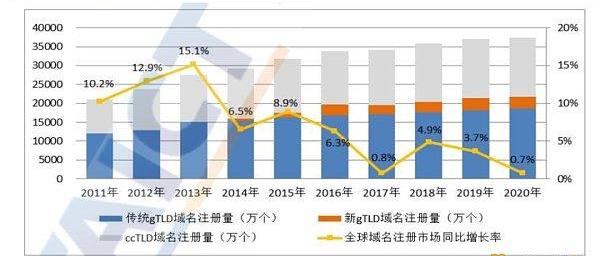傳統域名市場已經接近飽和。隨著互聯網快速發展,域名市場在過去20年增長迅速,但目前已經接近飽和。根據中國信通院數據,截至2020年底,全球域名注冊市場規模為3.74億個、我國域名注冊市場規模為4300.8萬個,其中新通用頂級域域名注冊市場規模分別為3125.2萬個和718.1萬個,較上年有一定下降。