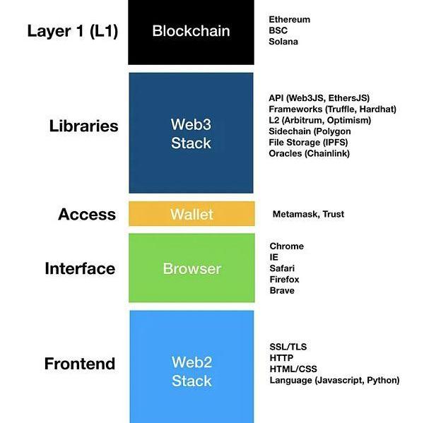 Web3堆棧由創建dApp的構建模塊組成,這些dApp將用戶連接到區塊鏈上的數字資產(如以太坊、幣安智能鏈、Solana)。有很多不同的類別,從文件存儲,索引,查詢,鏈下(第2層或L2)協議,開發框架,身份(如錢包)和預言機等等。這些可以用API,開發人員可以使用這些API調用例程和方法來訪問區塊鏈。
