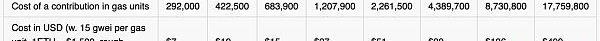 在鏈上運行設置的主要挑戰是使受信任的設置儀式盡可能高效。理想情況下,提交捐款的費用不超過50美元。。下面,我們提供有關設置中最昂貴部分的更多詳細信息。較低的Gas成本將降低貢獻成本,并允許構建更長的參數!