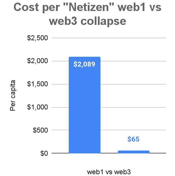 在“人均”的口徑上,每個“網民”的web3崩潰的成本約為每人65美元。在web1的崩潰中,這意味著每人高達2089美元。