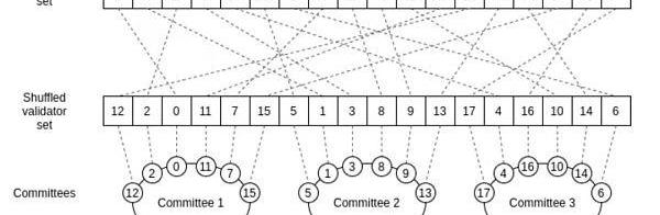 因此,我們所做的就是將驗證工作隨機地進行拆分。我們隨機打亂驗證者列表,讓已打亂列表中的前100個驗證者來驗證第一個區塊,讓已打亂列表中的后100個驗證者來驗證第二個區塊,以此類推。這種被隨機選擇來驗證一個區塊(或執行一些其他任務)的一組驗證者被稱為委員會。