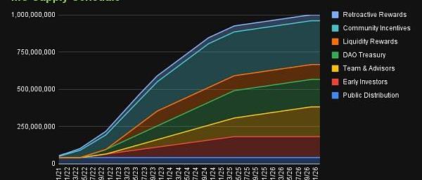 DAO的初始代幣發布日期是2021年2月9日。該代幣的最大供應量最初上限為312,000,000,自創世以來具有通貨膨脹類型的排放率。最大供應量將根據協議設定的銷毀機制和團隊治理進行減少和調整。DAO的供應預計將在2025年4月完全歸屬。