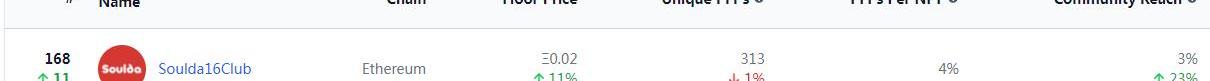 國人比較喜歡的NFT項目就比較尷尬了,Soulda排名168位,頭像使用率僅為4%,Twitter用戶上所有使用的不重復Soulda圖片也只有313張。至于黑貓,則根本沒有出現在這個表單中,也許是黑貓在海外影響力不夠,平臺方沒有統計到亦或許是其他原因,在數據方面黑貓是有資格進入排行的,平臺開放申請入口,官方運營人員也可以申請一下。