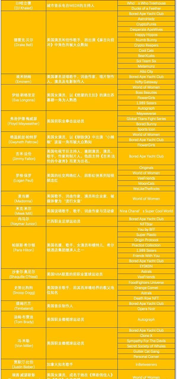 XRP/HKD-1.15%自NFT以社交網絡頭像、數字藏品等形態進入消費市場后,娛樂圈、體育圈的名人也開始為各種NFT代言,甚至有名人參與到一些NFT項目的發行制作中。