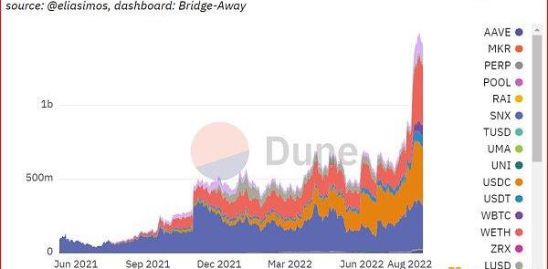 Dune數據顯示,截止8月17日,OptimismBridgedTVL達到近14.27億美元,而歷史最高值發生在7月13日的14.95億美元,也即目前跨鏈橋的TVL數據仍屬于歷史高位。