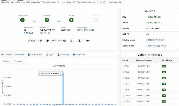 通過觀察信標鏈的區塊鏈瀏覽器我們可以看到,下圖詳細信息顯示該周期被99.8%的活躍驗證者即總質押量13,177,296個ETH中的13,150,835個ETH的權益投票簽名并出塊,每個插槽中的分片區塊都由不同的驗證者出塊并經過三分之二以上活躍驗證者的投票簽名通過出塊。