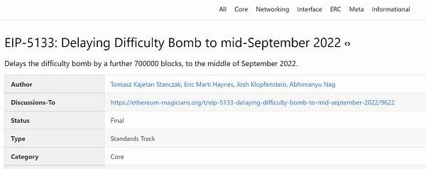 在最近一次的難度炸彈推遲EIP-5133提案中,難度炸彈被推遲到了2022年9月中旬。