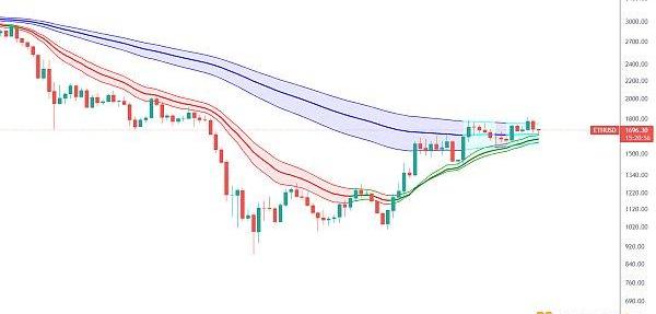 ETH也未破上行軌道支撐,整體震蕩向上趨勢也未改變,同時下方前期突破的周線支撐1600也未破,目前綠色軌道嘗試上穿,不排除ETH整理后再次上攻可能。