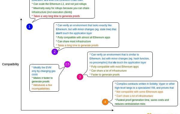 類型1:ZK-EVM是我們最終需要的,使以太網第1層本身更具可擴展性。從長遠來看,在類型2或類型3ZK-EVM中測試出的對以太的修改可能會被引入到以太本身,但這樣的重新設計伴隨著它自己的復雜性。