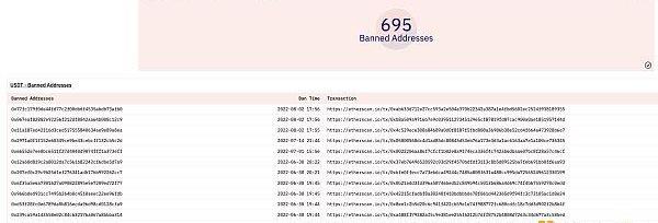 Tether的USDT也可以在以太坊智能合約層面被列入黑名單。可以在Dune上看到被禁止的地址列表。*尚未*添加Tornado。