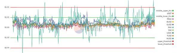 作為美元穩定幣,與美元的錨定程度顯然是穩定幣市場競爭格局的重要驅動因素。根據DuneAnalytics統計,近期,大部分穩定幣與美元的錨定程度接近、脫錨程度低,USDP和GUSD或因交易量較小、滑點高等因素,錨定程度較低,尤其是USDP。我們認為,與美元的錨定度是美元穩定幣的基本門檻,不足以構成關鍵競爭優勢。