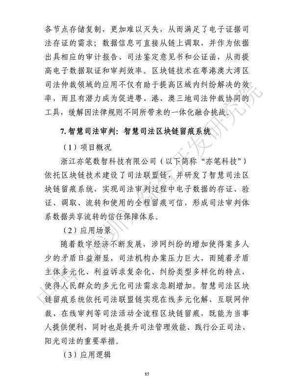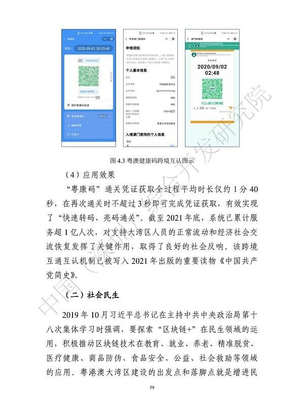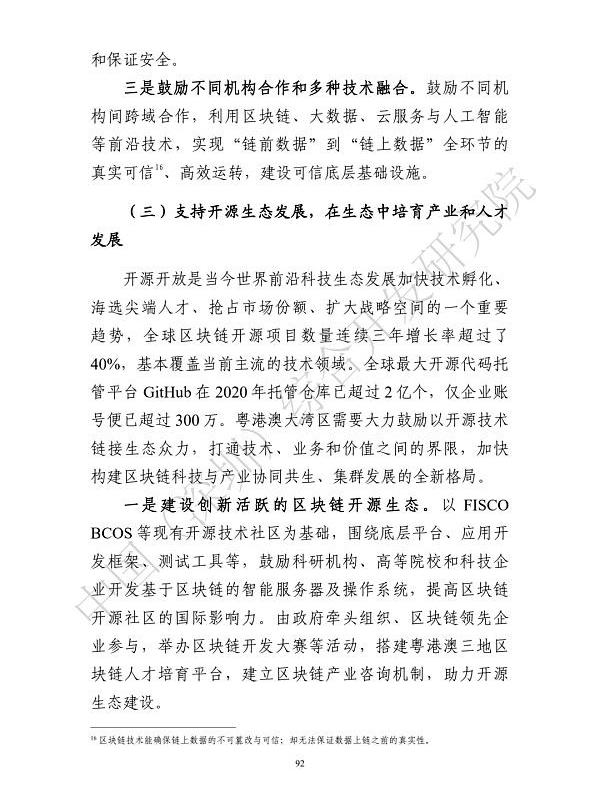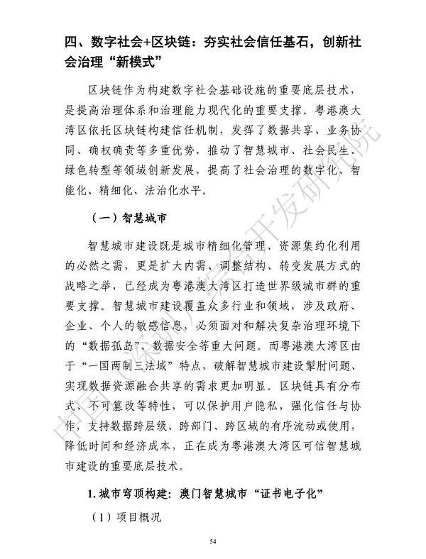 作為一大亮點,報告引用了大量基于FISCOBCOS,并在粵港澳大灣區落地的應用案例:在數字經濟發展方面,“粵澳跨境數據驗證平臺”、“灣區金融科技人才鏈”、“珠三角征信鏈”、“深證金融區塊鏈平臺CapitalBCOS”等案例入選;在數字社會建設方面,“澳門智慧城市建設之證書電子化”、“粵澳健康碼跨境互認”、“騰訊99公益日”等案例入選;在區塊鏈推動數字政府建設方面,“網貸機構良性退出投票平臺”、“區塊鏈司法存證仲裁服務平臺”、“深圳水務集團工地安全管理系統”、“智慧司法區塊鏈留痕系統”等案例入選。