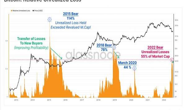 下圖顯示了未兌現的總損失占當前市值的比例。在這里,我們可以看到,未兌現虧損總額相當于市值的55%左右,高于2020年3月,與2018年熊市低點的規模差不多。