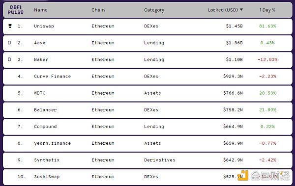 DeFi項目鎖定資產前十排名及鎖倉量,數據來源:Defi Pulse