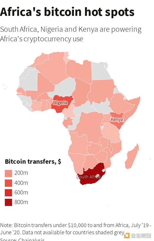 美國區塊鏈研究公司Chainalysis的數據顯示,每月進出非洲的加密貨幣轉賬金額在1萬美元以下,主要由個人和小企業完成,今年6月轉賬金額達到3.16億美元,增幅超過55%。