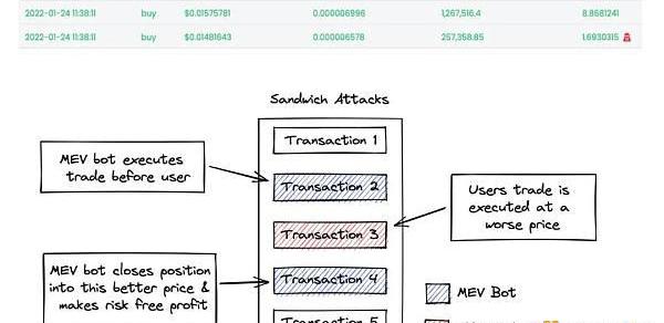 SandwichAttack是前兩種攻擊的結合,對交易進行前后夾擊。通常被稱為夾子。例如MEV機器人在交易前放一個買單,在交易后放一個賣單,讓用戶的交易在更差的價格執行。