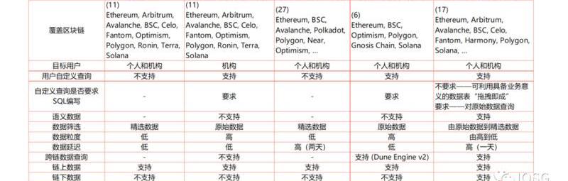 本節以內容視角和用戶視角,從數據豐富度(覆蓋區塊鏈數量)、數據粒度、數據延遲、平臺易用性和查詢自由度等維度來對比幾家主流的鏈上數據分析平臺,包括Nansen,TokenTerminal,DuneAnalytics,FootprintAnalytics。