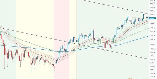 短線看日線依舊受制于上方下降軌道壓制,前幾天沖高回落也未破下方三角線支撐20000和19500,后面有望再次沖擊壓制軌道,多次試探消磨那么突破概率加大,當然站上也不意味著立馬啟動強勢行情,但是整體有望震蕩走強趨勢,短期壓力21750,軌道壓制22600-23300.