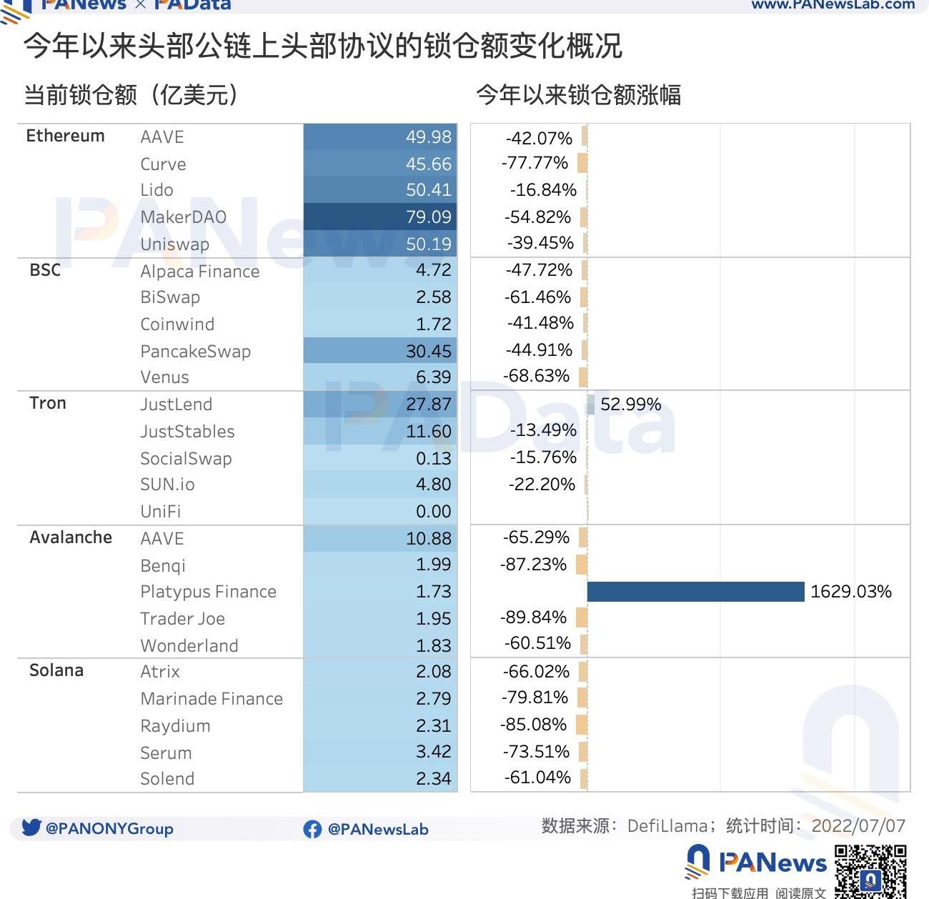 為了觀察公鏈與協議的不同變化,PAData還選擇了Ethereum、BSC、Tron、Avalanche、Solana上各自鎖倉額最高的5個頭部協議進行觀察。總的來說,Ethereum上的頭部協議鎖倉額都超過了50億美元,其中MakerDao超過了79億美元,遠高于其他頭部協議。其次,BSC上的PancakeSwap,Tron上的JustLend、JustStables,Avalanche上的AAVE的鎖倉額也都超過了10億美元。除此之外,其他頭部協議的鎖倉額基本在2至4億美元之間。從上半年的鎖倉額變化來看,除了Avalanche上的PlatypusFinance和Tron上的JustLend分別實現了1629%和53%的增長以外,其他頭部協議都有不同程度「縮水」。其中鎖倉額跌幅較大的有Ethereum上的Curve,Avalanche上的Benqi、TraderJoe,Solana上的MarinadeFinance、Raydium、Serum,跌幅都超過了70%。