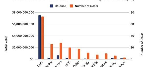 但就原始數字和庫房規模而言,與DeFi相關的DAO有巨大的領先優勢。DeFi類別占所有DAO持有的庫房價值的83%,按數量計算占所有DAO的33%。