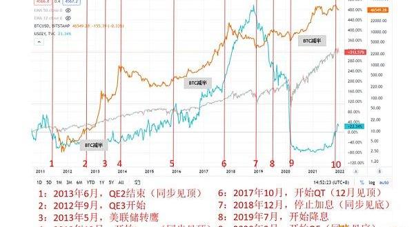 3.金融屬性—流動性方向,目前高度關聯傳統風險金融市場,所以受美聯儲貨幣政策,利率+資產負債表等宏觀流動性因素影響較大。