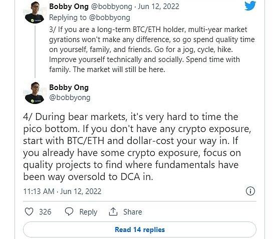 如果你發現最好的行動方案是堅持冬天到春天,請花時間投資學習更多關于加密和NFT投資的知識。Ong表示,他將利用這段時間尋找有希望的新項目。他在推特上寫道:“如果你是BTC/ETH的長期持有者,多年的市場波動不會有任何影響,所以請把美好的時光花在自己、家人和朋友身上。去慢跑,騎自行車,遠足。在技術和社交方面提升自己。”