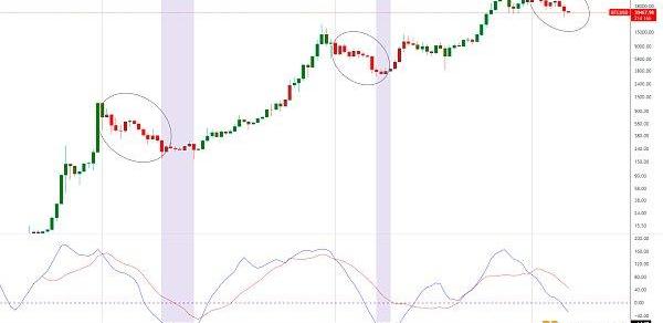上圖為BTC周線,歷史上熊底一般需要附圖曲線回落至區間通道下方見紅區域,2014年熊底、2018年熊底和2020年3月瀑布底均是這種走法,目前顯然還有距離,形態上BTC也還處于下降平行通道,近期持續位于潛在圓弧頂頸線一帶徘徊,周線一旦有效跌破28500,后面恐將再次下殺,注意風險。
