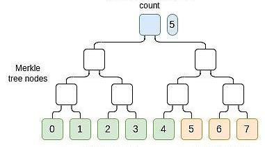 通過在鏈上發布單個Merkle根和最大計數,你可以提交有限數量的證明。在這個例子中,只有五個可能的有效Merkle分支可以滿足證明檢查。精明的讀者可能會注意到與Plasma鏈在概念上的相似之處。