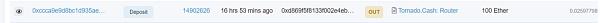 第三步,攻擊者賣出釣魚獲得的NFT,通過外部地址,將142ETH發送到Tornado.cash。
