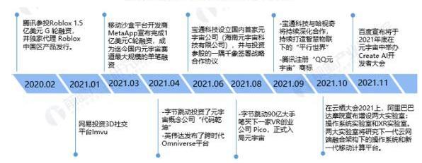 國內較早布局元宇宙業務的公司包括騰訊、網易、字節跳動等。早在2020年初,騰訊便已參投Roblox1.5億美元G輪融資,并獨家代理Roblox中國區產品發行。字節跳動分別于2021年4月和6月投資了元宇宙概念公司"代碼乾坤"和買下Pico。2021年11月,百度更是宣布將于年底在元宇宙中舉辦CreateAI開發者大會。