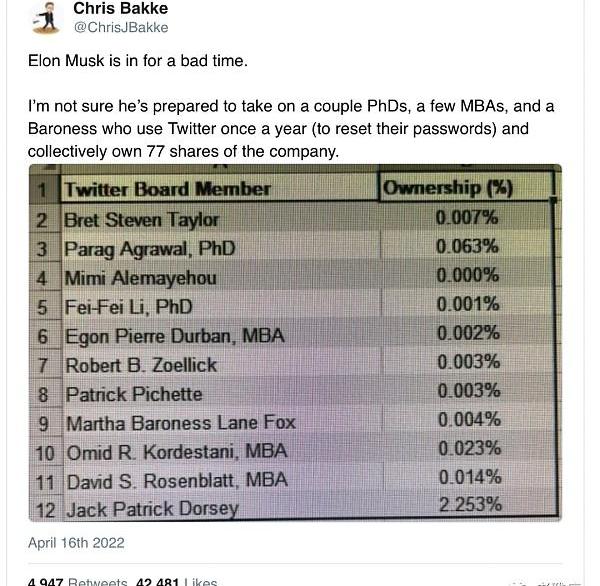 給TweeterDAO一個董事會席位是發行代幣和完全去中心化的一個步驟。這離他所認為的人類統治火星應該采用的直接民主還有一步之遙。但這是一個由幾乎沒有所有權并且幾乎沒有使用該產品的人組成的董事會朝著正確方向邁出的一大步。