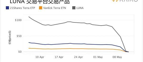 Luna的歷史性崩盤導致了Luna指數ETP的暴雷,上周這些產品幾乎失去了全部市值。21Shares的TerraETP-世界上第一家TerraETP,于1月份在瑞士六大交易所上市,周四收于0.004美元,自5月6日以來下跌了99%以上。在幾個歐洲市場交易的VanEck的TerraETN也面臨著類似的下跌,本周收于0.005美元。周五,這兩種投資工具都暫停了發行和贖回。