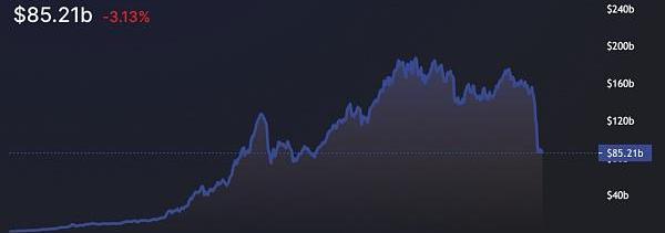 收益的枯竭也伴隨著DeFi整體的資金流出,隨著UST的崩潰,所有區塊鏈的TVL(鎖倉總價值)在一周內從1370億美元下降到850億美元,下降了近38%。我們也看到了許多錨定幣,比如stETH-ETH,由于恐慌在整個系統中蔓延而偏離了掛鉤。