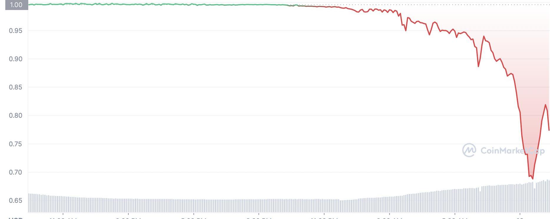 據CoinMarketcap數據,UST市值在今早短短數小時內蒸發近40億美元,目前跌至約140億美元。