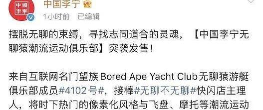 這張圖的中心是明顯的無聊猿的邊緣輪廓,再加上“中國李寧-無聊快閃店”的說法,自然讓大家紛紛猜測,李寧和無聊猿IP合作了?