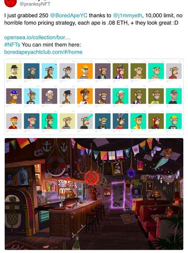 “BAYC”于2021年4月23日開始發售,每個售價為0.08以太,當時價值約190美元。BAYC在起初并沒有受到許多關注,直到5月1號的一天,知名收藏家Pranksy關注到了這個項目,并宣布已經購買了250多只猿猴。從他發布推特的那一刻起,BAYC的銷量、用戶、交易數激增。僅在117分鐘后,BAYC售罄。