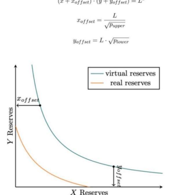 這樣突出優勢的核心原因在于UniswapV3創新性的集中流動性機制。用戶在提供流動性時可以選擇指定的價格區間,從而達成集中流動性以及定制流動性的功能。在用戶設定的價值區間內,AMM依舊基于V2的恒定乘積算法。相比于UniswapV2的默認的全區間流動性,UniswapV3的「區間流動性提供」極大的提升了流動性提供者的自由度以及提供資金的資本效率,因此,在市場價格附近集中流動性的概念取代了「無限」流動性的概念。