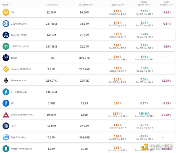 Aave目前支持20種數字貨幣:DAI、USDC、TUSD、USDT、sUSD、BUSD、ETH、LEND、YFI、BAT、REN、ENJ、KNC、LINK、MANA、MKR、REP、SNX、WBTC、ZRX。