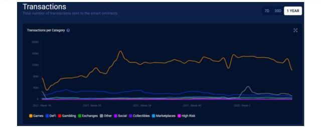 AxieInfinity的成功吸引了大量項目方加入進來,GameFi已經成長為區塊鏈行業的“獨立領域”。截至2021年11月,DappRadar數據顯示GameFi領域在全網累計已有836個鏈游上線,日均用戶數量達百萬人,日交易量達到1897萬美元。從日均交易數來看,GameFi板塊位居各細分板塊第一,可見其活躍性。同時,GameFi和NFT類似,吸引了許多非區塊鏈用戶參與進來。