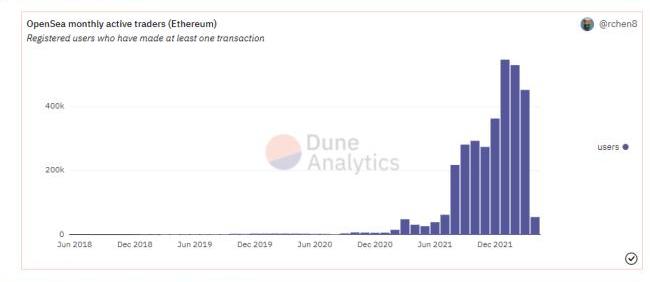 2)NFT:2021年中旬,CryptoPunks和BoredApeYachtClub(BAYC)地板價突破了100ETH,同時大量明星和名人的持有使得整個NFT板塊出圈。不同于DeFi的用戶群體集中于區塊鏈行業內部,NFT吸引力許多圈外人士的目光,使更多的人了解到區塊鏈技術。不僅NFT項目數量如雨后春筍一般飛速發展,NFT平臺從數量和體量上均在增長。以其中最大的平臺Opensea為例,從去年7月開始迎來了拐點。活躍用戶數在今年年初突破了50萬大關,達到約54.6萬。