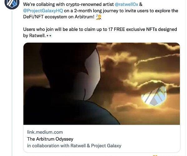 XRP/HKD-0.07%4月12日,以太坊擴展方案Arbitrum宣布獎舉辦Arbitrum生態體驗獎勵計劃,獎品為ProjectGalaxy和加密藝術家Ratwell、Sugoi設計和發行的NFT。