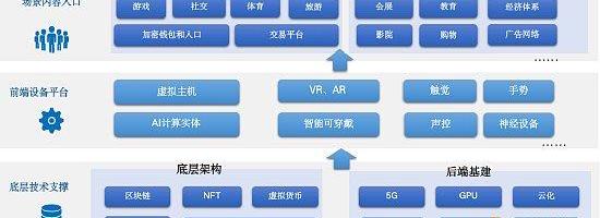 清華大學新媒體研究中心發布的《2020-2021年元宇宙發展研究報告》中將產業劃分為場景內容入口、前端設備平臺、底層技術支撐三個部分。