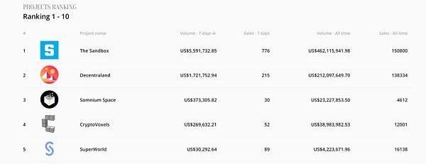 TheSandbox世界中的LAND總數共有166,464塊,永不增減,其中123,840塊可以出售;25,920塊作為獎勵分配給合作伙伴、創造者、玩家;另外16704塊作為舉辦活動和游戲的場所。玩家購買它來構建互動體驗。一旦用戶擁有了一塊土地,用戶就可以用游戲和資產來填充它。每個LAND都是位于公共以太坊區塊鏈上的唯一NFT。在TheSandbox游戲世界中,每個LAND的大小為96x96米,足以支持所有類型的區塊鏈游戲體驗,但又不會太大以至于無法由一個人管理。2022年4月8日,TheSandbox大中華區總監蔡和偉表示2021年TheSandbox虛擬土地銷售額超過3.5億美元。目前TheSandbox項目在所有元宇宙項目中最火熱。根據nonfungible.com的數據顯示,TheSandbox項目的銷售額常年在所有元宇宙項目中排名第一。根據寫稿時,TheSandbox過往7天的銷售額為5591萬美元。