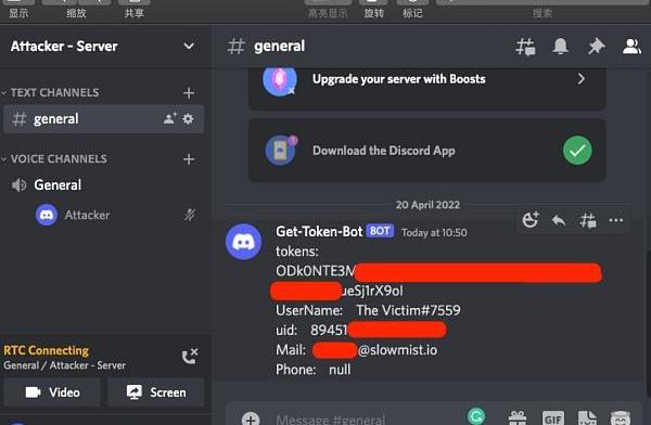 拿到了Token等同于登錄了Discord賬號,可以做登錄Discord的任何同等操作,比如建立一個Discordwebhook機器人,在頻道里發布公告等虛假消息進行釣魚。