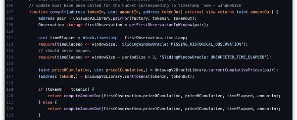 在此,成都鏈安建議項目方使用足夠長的時間窗口,例如可以參考以下Uniswap的示例代碼,timeElapsed必須大于24小時以上。